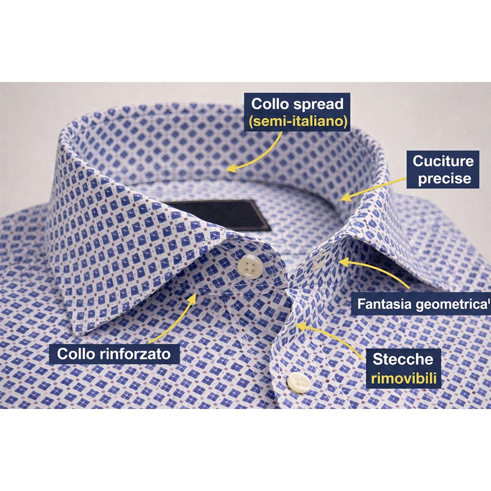 Il collo semi-italiano (spread) valorizza il design della camicia ed è perfetto sia con cravatta sia indossato aperto per uno stile più casual. La costruzione curata e le cuciture precise garantiscono una vestibilità elegante e una lunga durata nel tempo.