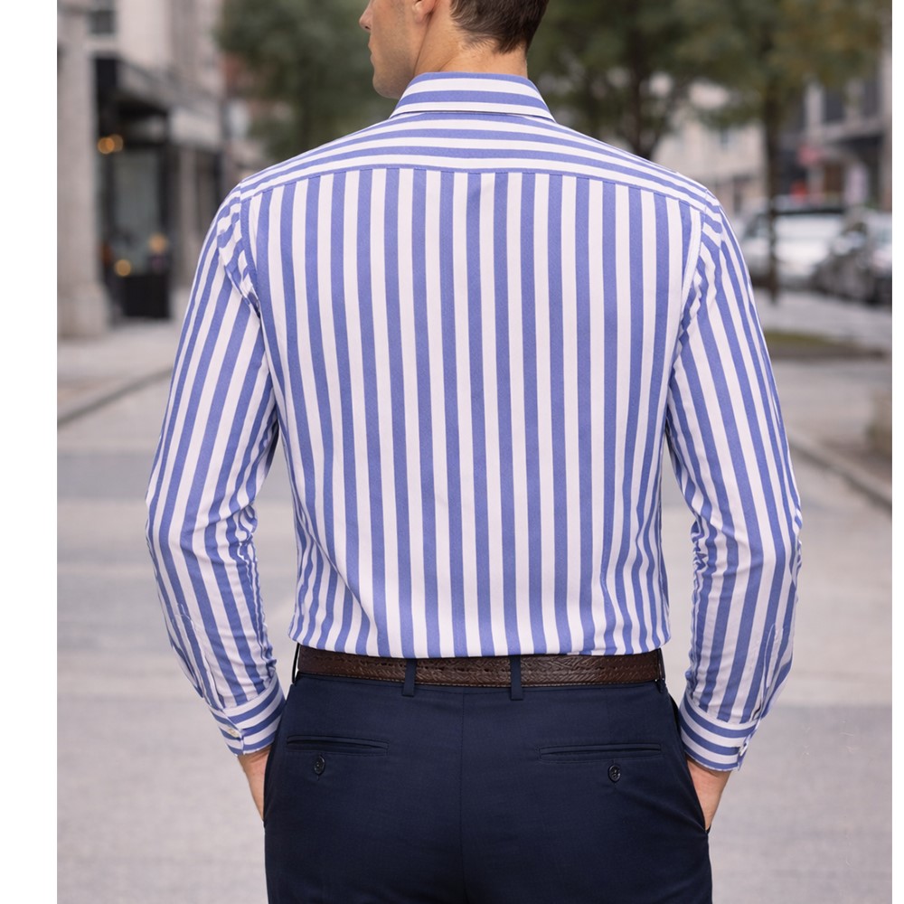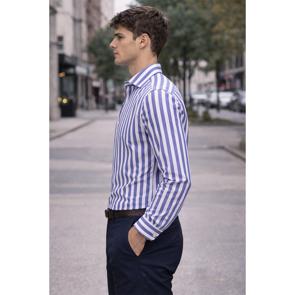 Elegante e versatile, questa camicia uomo a righe blu e bianche è realizzata in cotone di alta qualità, perfetta per garantire comfort e traspirabilità durante tutta la giornata.