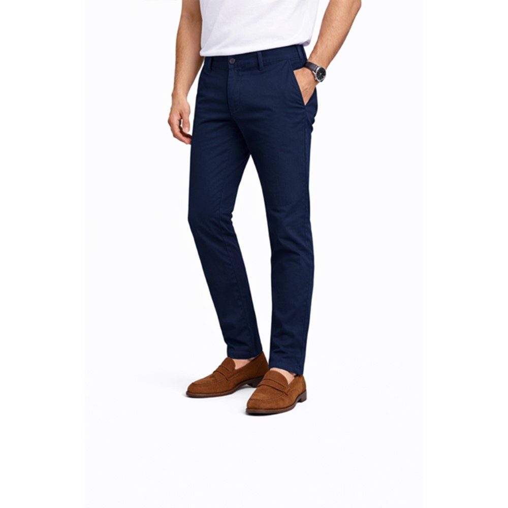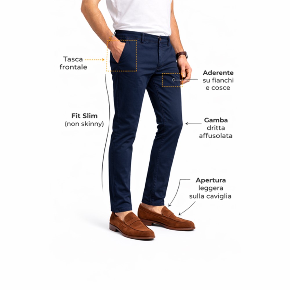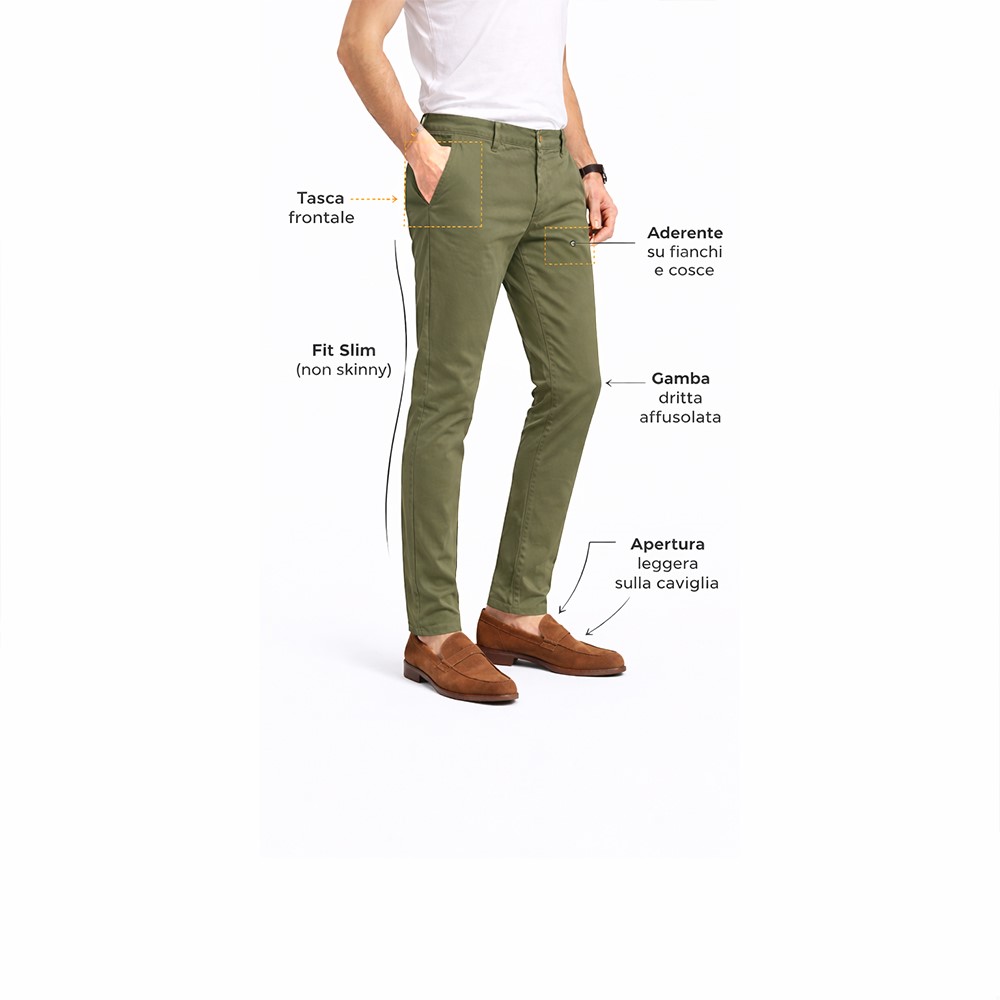 Aggiungi un tocco contemporaneo al tuo guardaroba con questi pantaloni chino da uomo. Il fit slim (non skinny) valorizza la silhouette senza stringere, garantendo comfort e libertà di movimento per tutta la giornata.